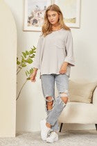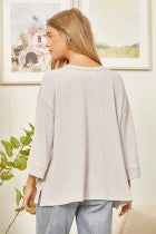 This knit top features a stylish design with 3/4" length sleeves, making it perfect for transitional weather. The fabric showcases a textured curly rib pattern, adding depth and visual interest to the garment. It provides a comfortable fit, allowing for ease movement while maintaining a polished look. Non sheer, knit, stretchy.