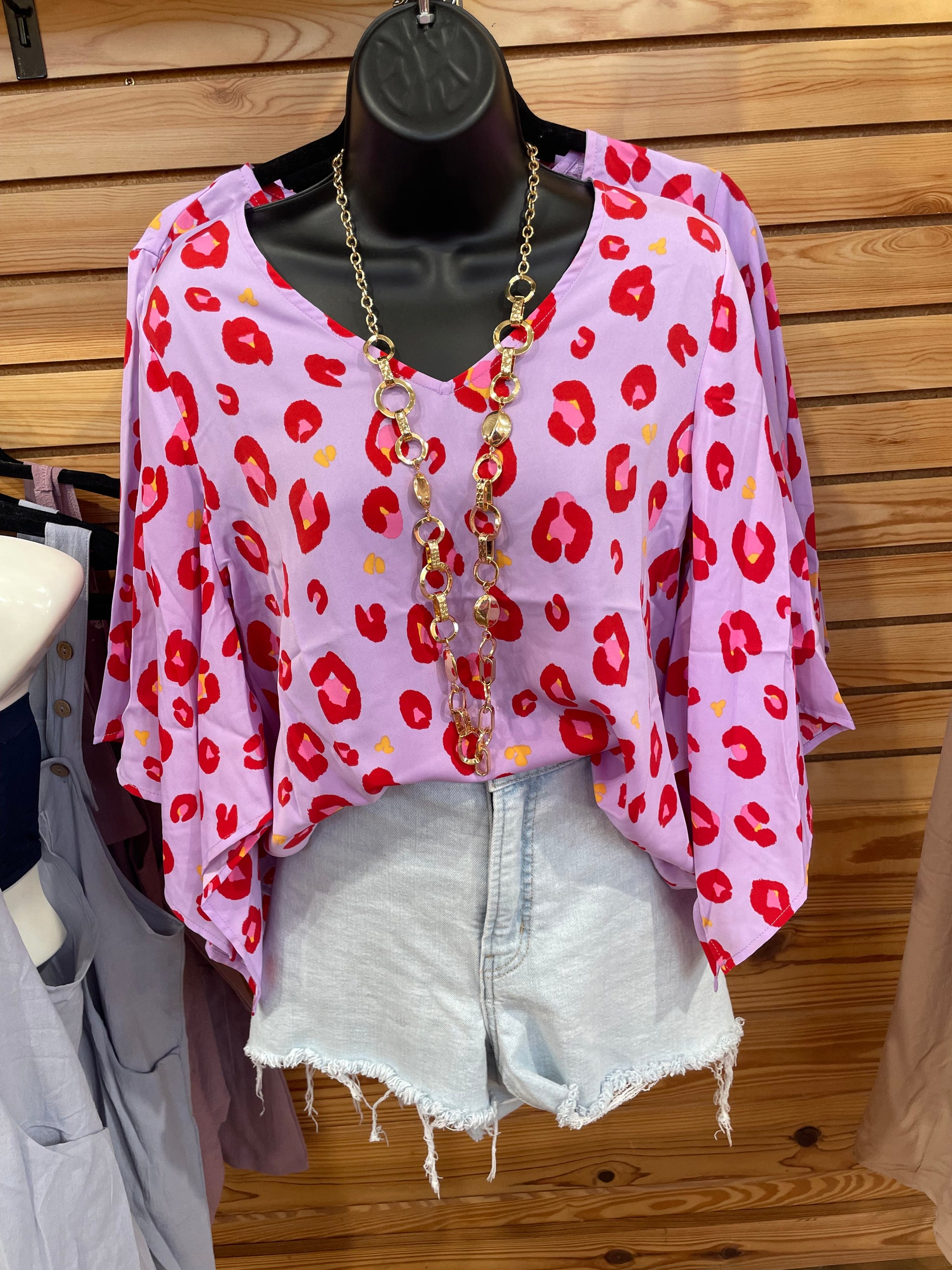 Leopard print top featuring beautiful print all over this top with a v-neckline and 3/4 sleeves. Non sheer