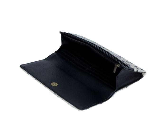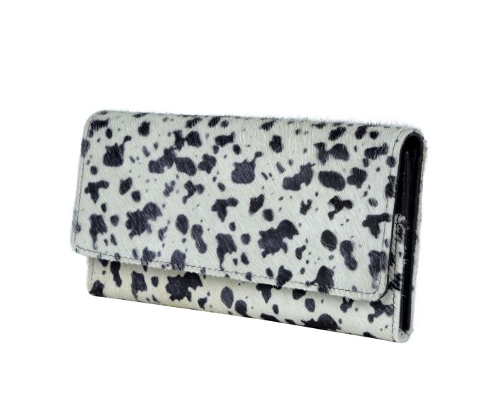 Introducing the Myra Ampfibian Wallet - a wild take on everyday practicality. With a playful animal print, off-white color, and black spots, this wallet is sure to make a statement. The soft fur adds a touch of luxury, while the back zipper pocket and magnet clasp keep your valuables secure. Go ahead, unleash your wild side!