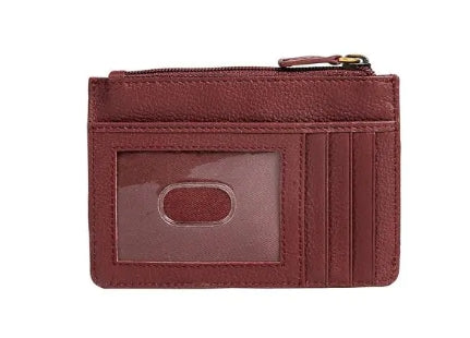 This alluring wallet offers compact form with high function in beautiful red leather. Features a central zippered pocket and several slots for cards and ID.