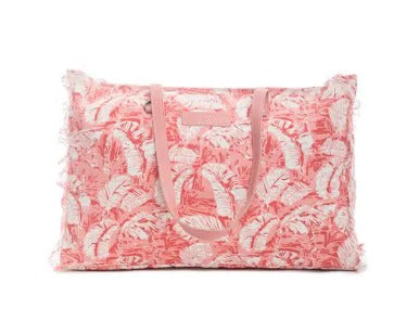 This bag exudes feminine charm and sophistication with its foliage print in soft pink and red hues. It combines style with functionality, featuring a spacious interior for your essentials. Frayed edge treatments complete the look, and the carrying straps are in sunrise pink leather. Zipper close top. Whether you're planning a romantic getaway or a relaxing weekend retreat, this is the perfect accessory!