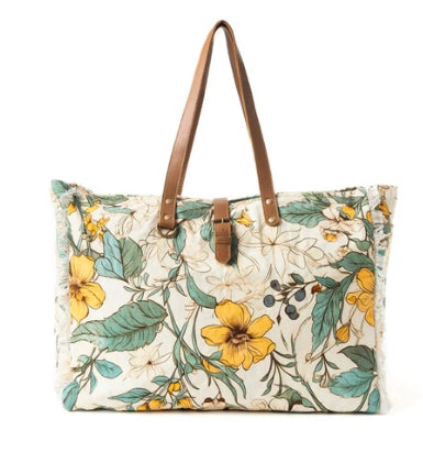 Escape in tropical style with our upcycled canvas weekender, featuring sun-kissed yellow plumeria blooms against lush foliage. Premium leather handles and brass hardware complement the sustainable design, while frayed edges add artisanal charm. The perfect eco-conscious companion for your weekend adventures. Durable carrying straps in matching leather complete the piece.