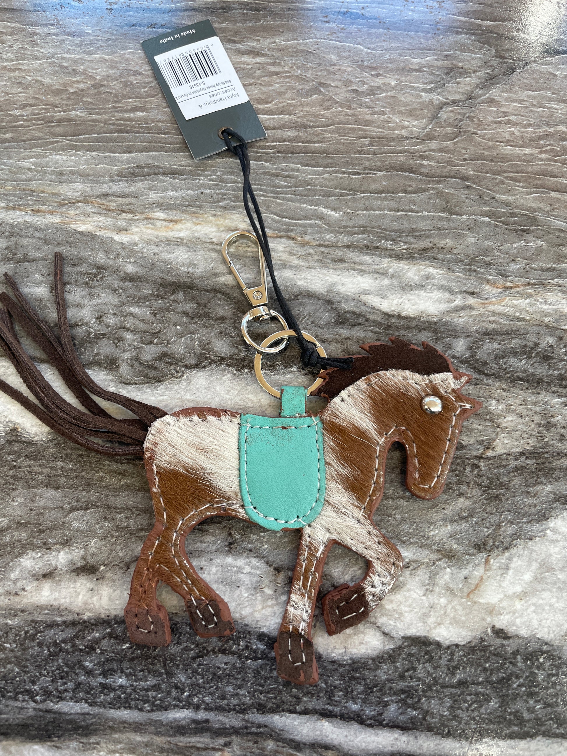 Celebrate rodeo heritage with this leather western keychain shaped like a galloping horse. Featuring brown hide texture, a turquoise saddle patch, and fringe tail accents, it brings western ranch character to your everyday style. Its detailed silhouette makes it a collector’s favorite, while the bold design ensures this western style keychain always stands out.