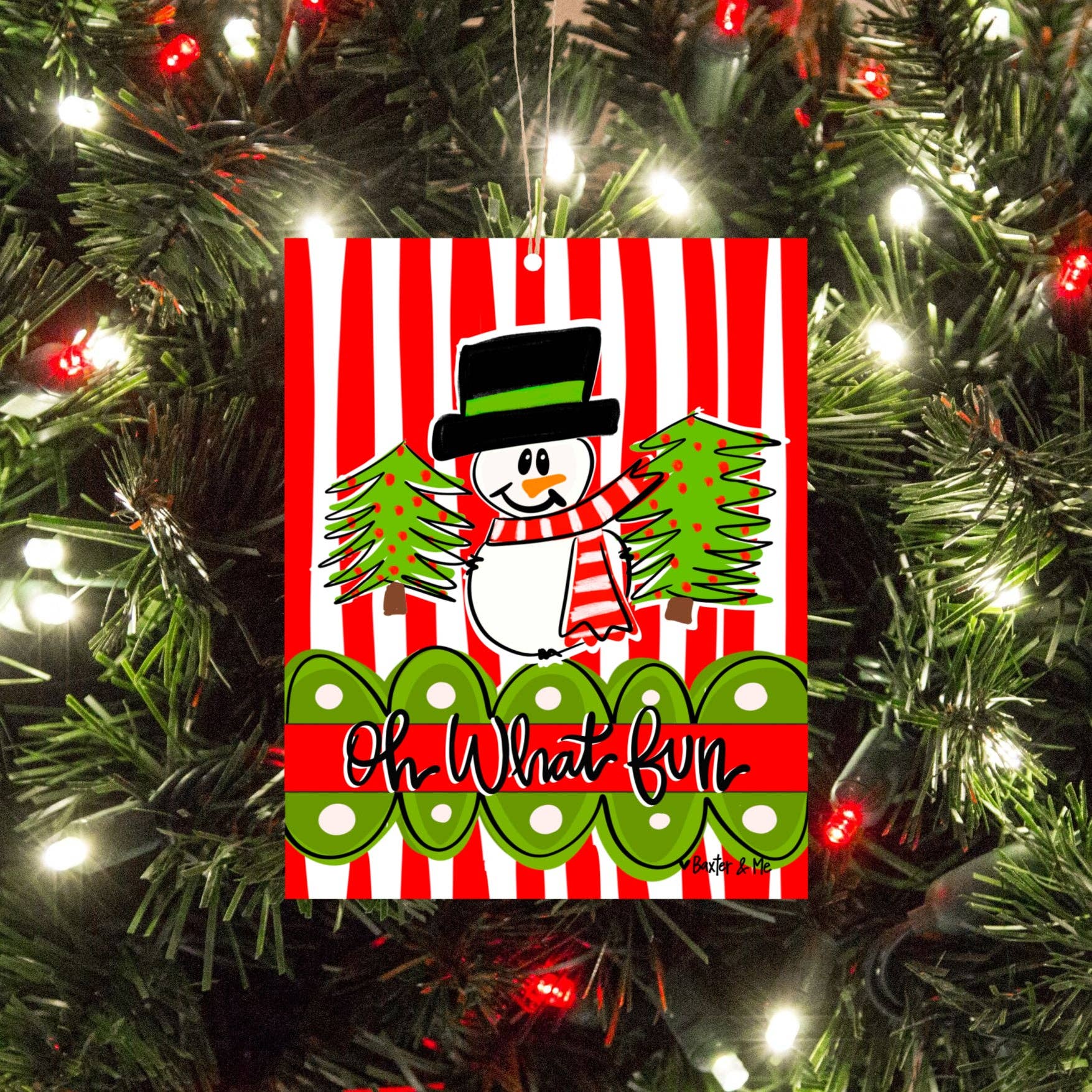 Our wood ornaments feature original artist-created designs and blank backs that are perfect for personalization. Each ornament measures 3.75" wide and 4.75" tall and includes a hand-tied jute hanger.