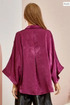 This oversized shirt top features button closure on front with 3/4" sleeves. Dolman sleeves with collar detail. Oversized fit. Chic, trendy.